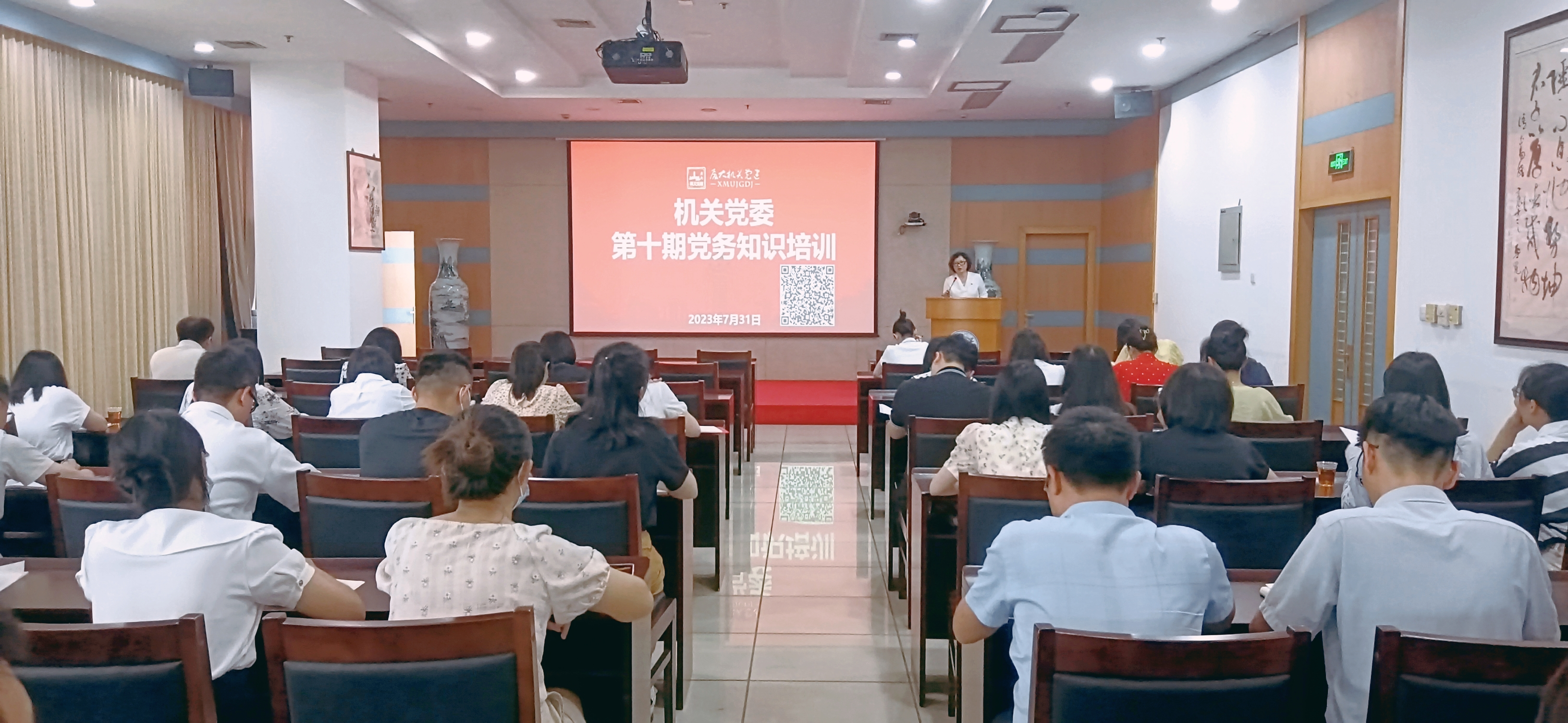 为扎实推动主题教育深入开展,进一步提高机关党务干部的政治素质和履职能力,结合机关党委主题教育调查研究中收集到的意见和建议,机关党委于7月31日下午,在颂恩楼220会议室举办了第十期机关党务知识培训,机关党委所属党支部组织委员和宣传委员共58人参加了培训。