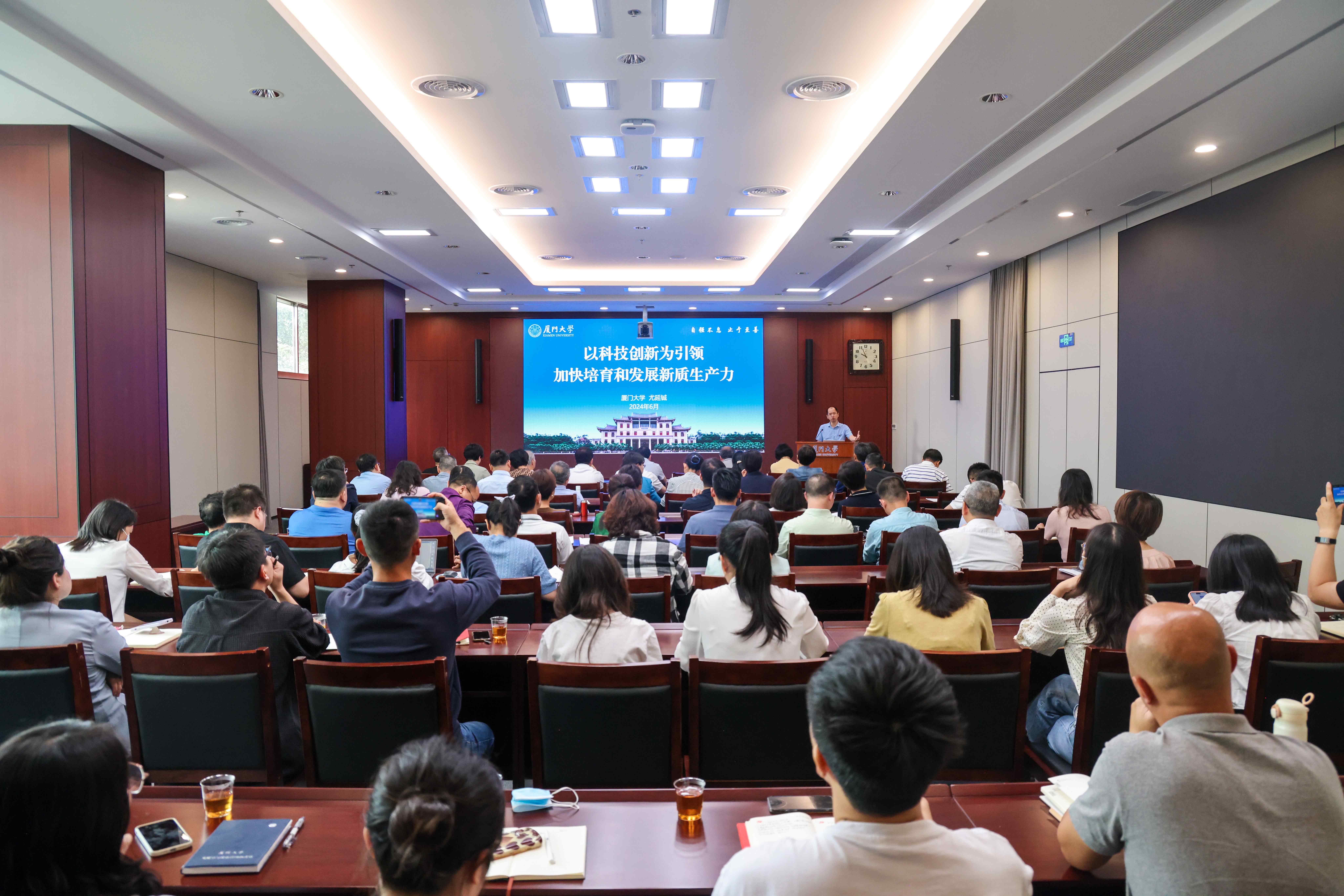 为深入贯彻落实党的二十大精神,巩固拓展学习贯彻习近平新时代中国特色社会主义思想主题教育成果,6月3日上午,厦门大学机关党员专题教学以线上线下相结合的方式在颂恩楼220报告厅举行,厦门大学党委常委、副校长、教育部“长江学者奖励计划”特聘教授尤延铖讲授专题党课。机关党委书记陈雪玲主持专题教学。