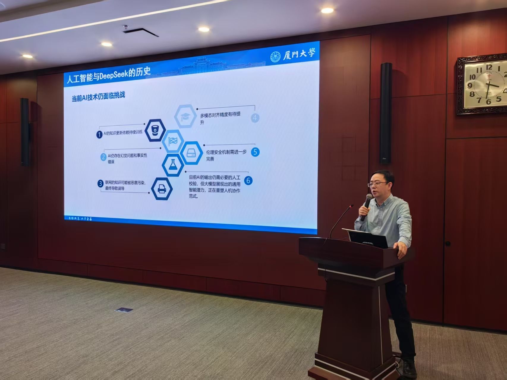 会后,机关党委举办机关干部数智素养提升专题培训,邀请机关党委委员、信息与网络中心许卓斌主任作题为《DeepSeek时代高校人工智能发展与应用》的辅导报告。许卓斌系统介绍了人工智能与Deepseek的发展历程,深入剖析了大模型在高校的典型应用和我校人工智能应用发展思路,他用大量的身边鲜活案例与场景阐述了数智技术如何在重构课堂生态、加速科研创新、改善管理服务效能等方面发挥关键作用,为参会干部带来了全新的视角与启发。许卓斌还传达了张荣书记在厦门大学2025年第一季度网络安全与信息化建设领导小组会议暨网络安全工作专题会议上的讲话精神。