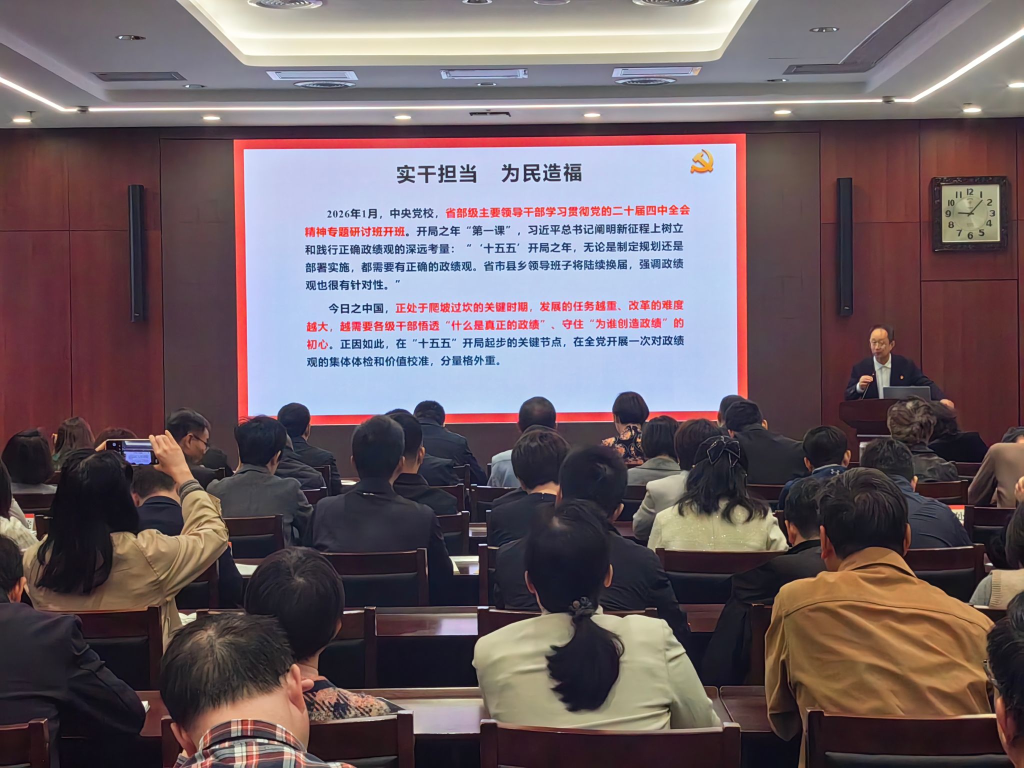 张艳涛围绕《习近平关于树立和践行正确政绩观论述摘编》,为机关处级领导干部梳理了党的十八大以来,习近平总书记关于树立和践行正确政绩观的一系列重要论述,系统阐释了正确政绩观的丰富内涵、内在逻辑和实践要求。张艳涛指出,重视学习是我们党推动事业发展的成功经验,在全党开展树立和践行正确政绩观学习教育,是党中央着眼党和国家事业发展全局作出的重要部署,对于推动“十五五”开好局、起好步,推进全面从严治党具有重大而深远的意义,机关各单位领导班子和领导干部要坚持学查改一体推进,高标准高质量落实好学习教育各项任务,把学习成效转化为立党为公、为民造福、科学决策、真抓实干的生动实践。