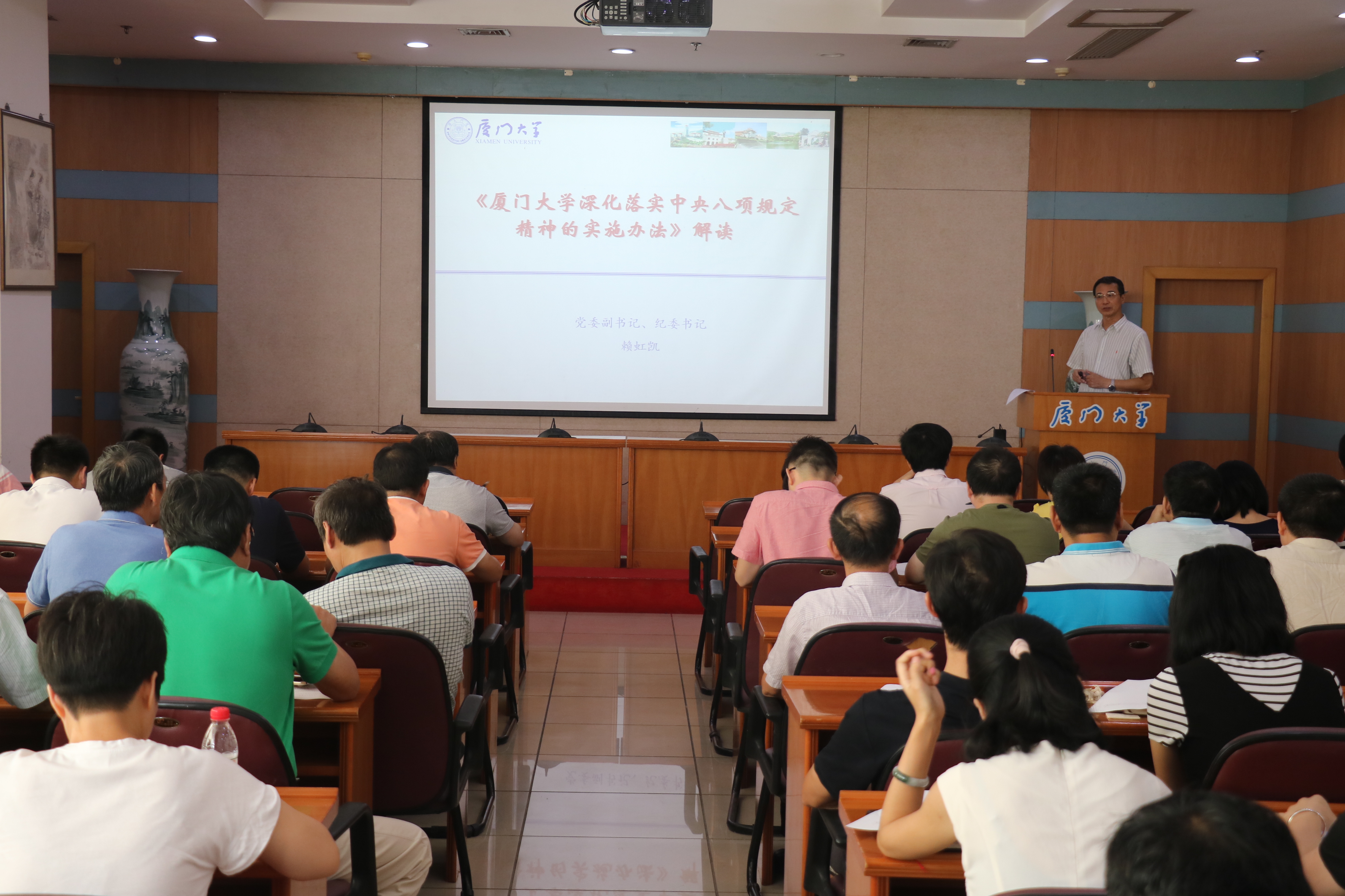 赖虹凯从“数说:八项规定改变中国”讲起,通过详实的数据和图表对党的十八大以来全国查处的违反中央八项规定精神的问题和情况进行了总体介绍。他重点解读了《厦门大学深化落实中央八项规定精神的实施办法》修订的背景、内容和亮点,并结合我校相关文件,针对学校当前实际情况,对加强出国(境)管理、严格请假制度、加强公务接待管理、加强办公用房和公车使用管理、加强兼职取酬和科技成果转化取酬管理、加强津补贴和奖金发放管理、严格规范领导干部操办婚丧喜庆等领域做了详细说明并提出明确要求。他还列举了国内兄弟高校违反中央八项规定精神的具体案例,对突出问题进行分类说明并深入剖析。