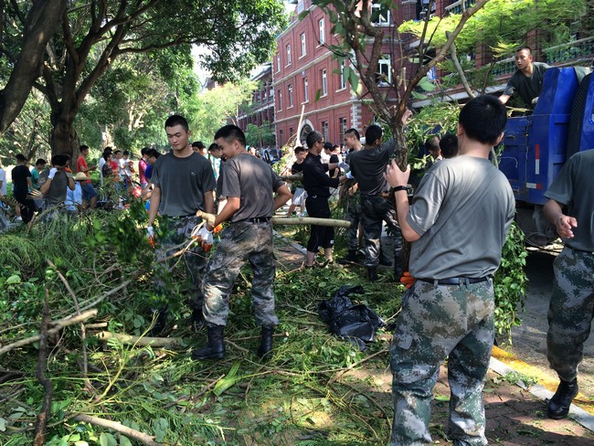 “现在要组建机关青年突击队,求附近志愿者加入,现在来颂恩楼220会议室集合。”15日中午11点多,台风过后的几个小时后,机关党委便在机关工作微信群中发出信息,号召青年教工加入学校灾后清障重建工作中。寥寥几句话,力量却无穷。信息发出后的两分钟,便有老师响应。随后,不断有人报名加入。短短1个小时内,近20名青年教师从各自家中赶来,组成机关青年突击队,帮助后勤部门一起清扫路面,搬除路障。16日,机关党委再次发出“机关青年突击队志愿者”招募令。17日下午14:00,一支身穿红色马甲的40多人的机关青年突击队又出现在嘉庚广场和芙蓉湖畔,进行路面及垃圾清理工作。