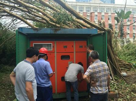 后勤集团水电中心全员连夜出动,前往分布在学校各处的20余台变压器,进行紧急抢修送电。中心经理郑文炉与另外两名值班人员,共同负责科艺中心、嘉庚楼群、水泵站三处供电,在凌晨三点多,台风正面袭击时,冒着生命危险前往送电。由于厦门市区部分高压线被风刮断引起短路,不得不多次往返变压器进行人工送电,保证校内供电正常,同时确保抽水泵持续工作,减缓地面积水。15日清晨7点半,思明校区、海韵公寓、曾厝垵公寓供电恢复正常。虽然连续工作二十几个小时,大家精疲力尽,但仍在恢复供电后,又赶往西校门抽水。