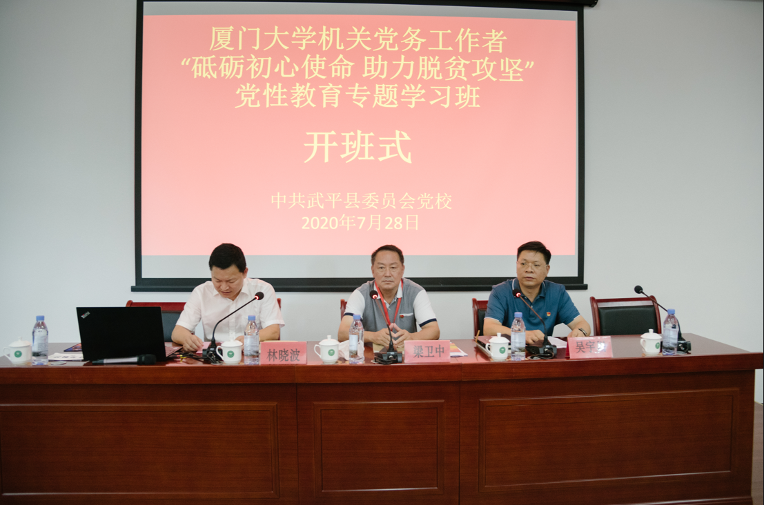 7月28日至30日,机关党委组织机关35个党支部的党务工作者共51人,以“砥砺初心使命 助力脱贫攻坚”为主题,严格遵守疫情防控要求,前往龙岩红色教育基地武平、上杭举办第五期机关党务工作者党性教育专题学习班。武平县委副书记、武平县委党校校长吴宇川出席开班式并致辞,机关党委书记梁卫中作开班动员,武平县委党校常务副校长林晓波主持开班仪式。