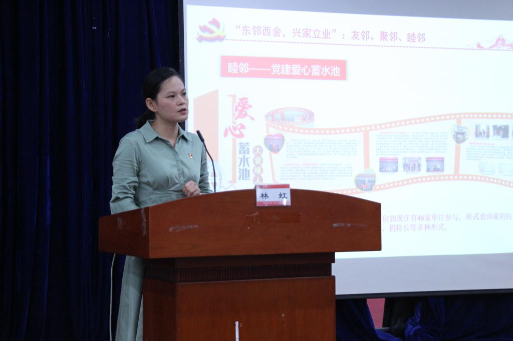 林虹结合自身丰富的基层治理工作经验,以“近邻党建”思维导图为框架,深入剖析了湖里街道南山新村小区、东兴小区、东渡社区共建共治共享的生动案例,并以“一齐来治家”五字诀精妙地概括了近邻党建的实现路径,将近邻党建“是什么”“怎么做”血肉丰满地展现出来,为兼职辅导员开展学生社区治理工作进行“手把手”式的指导。她指出,基层治理的“牛鼻子”在于激发基层党组织的力量,要把支部建在小区上,通过选优配强社区党支部书记凝核心、挖掘社区能人力量聚合力、优化整合社会资源壮大党建“朋友圈”,形成治理正循环。林虹强调,工作过程中还要注重培育党建典型,抓好品牌建设,既要“埋头干”,也要“大声喊”,通过用活用好党建典型培育十项准则讲好社区故事、不断发出党建好声音,实现“近邻党建”探索的生动化呈现。