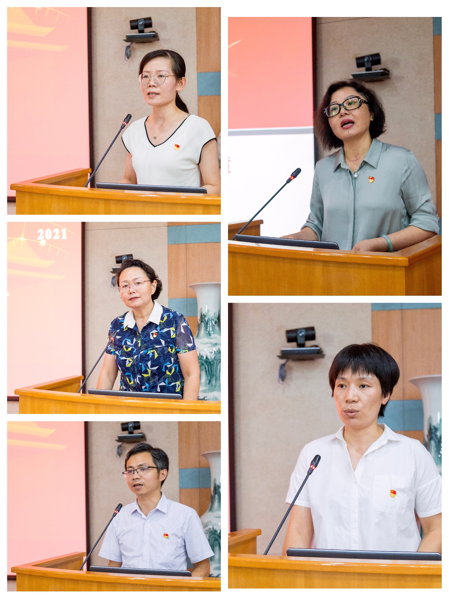 受表彰的机关先进党支部代表陈雪玲同志,校级优秀共产党员代表柯雅清同志、陈顺源同志,机关优秀共产党员代表申东杰同志,机关优秀党务工作者代表蔡莉莉同志先后发言。五位同志结合各自工作经历,用朴实而真诚的话语,表达了在新时代永远跟党走的信念与决心。大家纷纷表示,在新百年的征程中,要充分发挥基层党组织的战斗堡垒作用和共产党员的先锋模范作用,在与时俱进建设世界一流大学、全面建设社会主义现代化国家新征程中作出更大贡献。