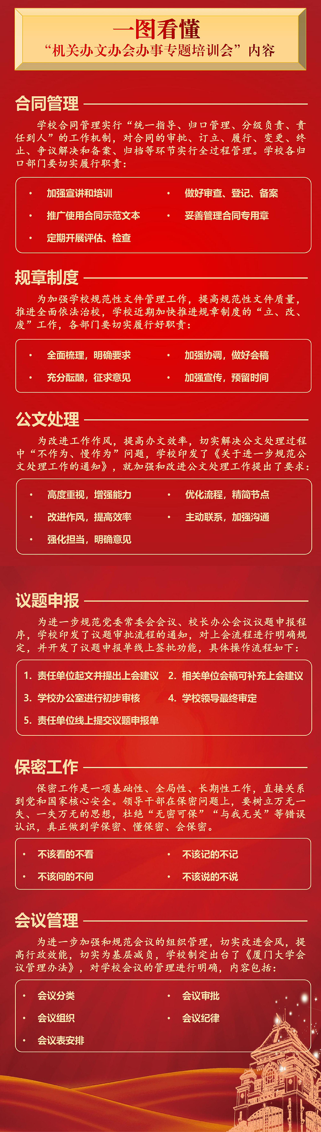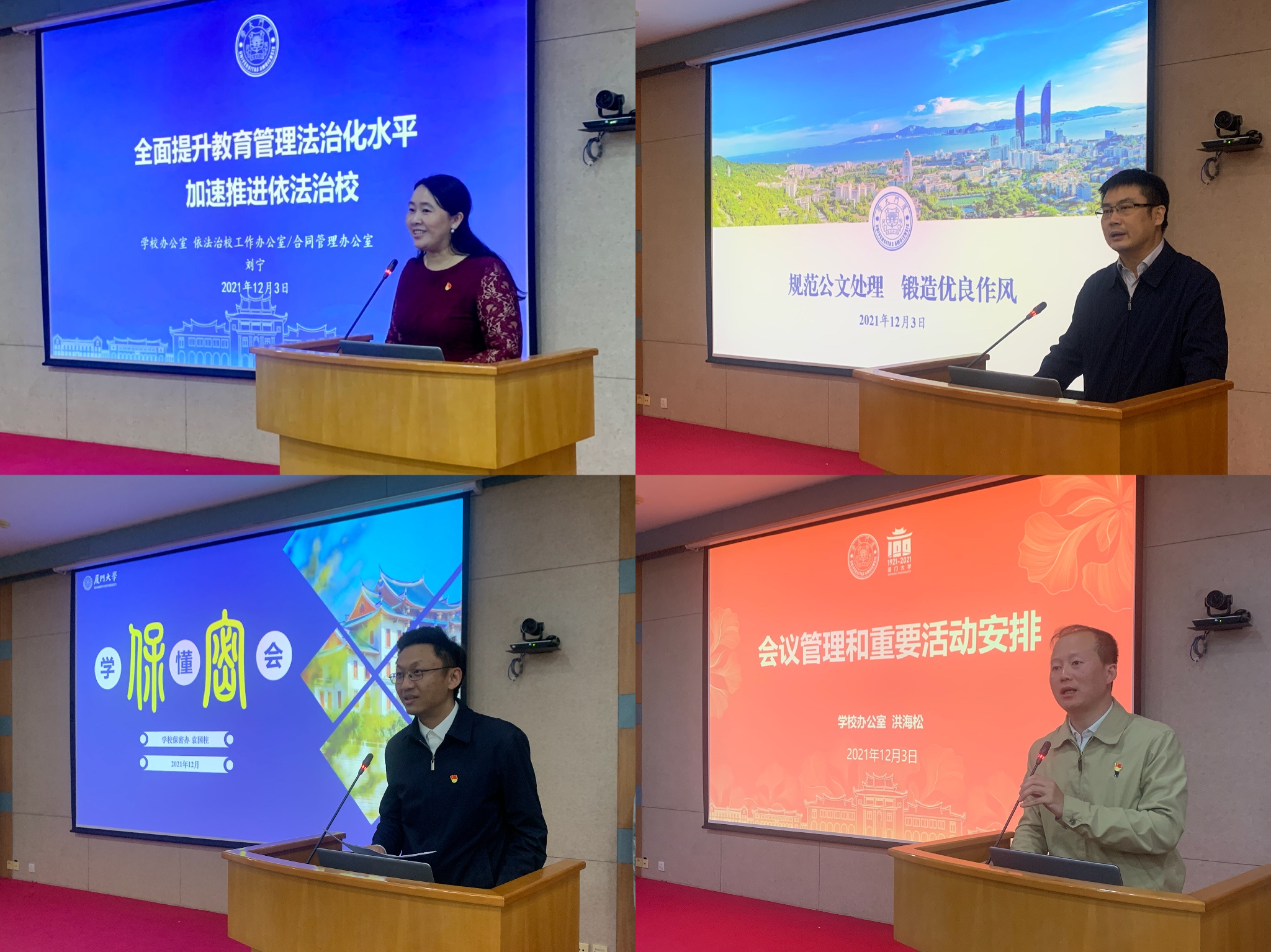 会议集体学习了学校最新出台的《厦门大学会议管理办法》《厦门大学办公室关于进一步规范公文处理工作的通知》《关于进一步完善党委常委会会议、校长办公会议议题审批流程的通知》等相关文件,结合具体案例通报了当前办文办会办事过程中存在的问题和风险点,并由学校办公室刘宁、马进龙、袁国柱、洪海松四位副主任分别围绕“合同管理和学校规章制度立改废”“公文规范处理”“保密管理和规范阅文”“会议管理和重要活动安排”等内容作了专业知识、易错事项、工作要求和实战技巧等方面的规范辅导。会议指出,文风会风体现党风政风,解决文山会海要在实干上下功夫,机关党员、干部要身体力行破除形式主义、官僚主义,不断加强和改进工作作风,确保办文办会办事优质高效,推动学校各项决策部署及时落地见效。