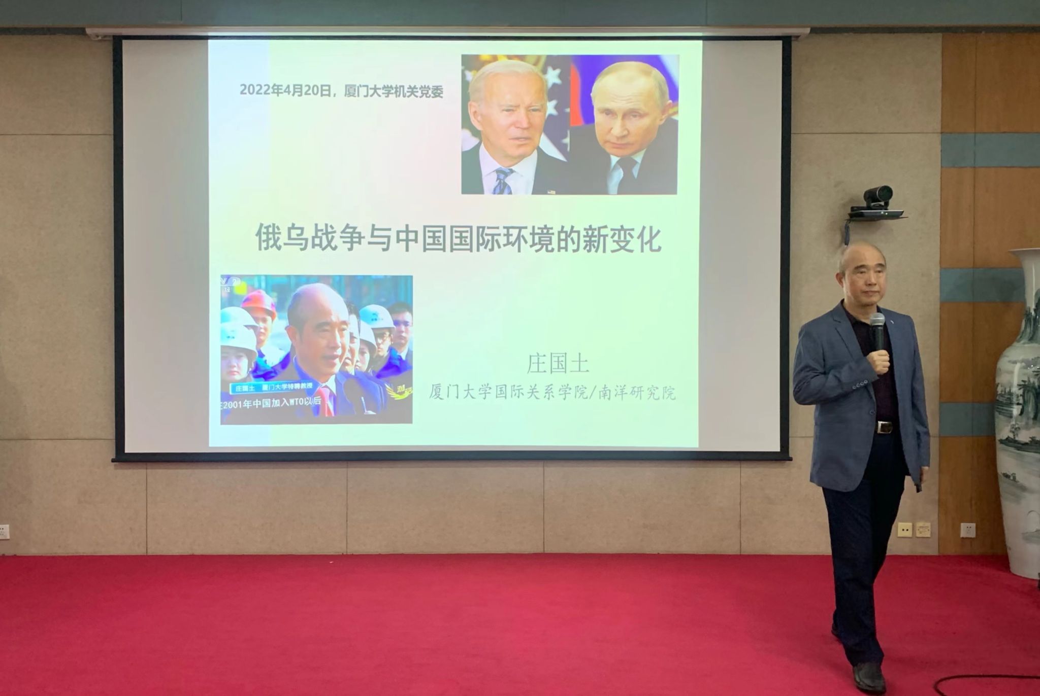 4月20日下午,“机关文化大讲堂”第九讲在颂恩楼220报告厅举行。厦门大学特聘教授、国际关系学院/南洋研究院前院长庄国土应邀做客讲堂,作题为《俄乌战争与中国国际环境的新变化》的专题报告。机关党委书记王炳华主持报告会。