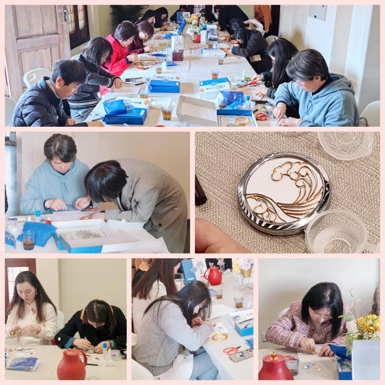 活动当天,恰逢“三八”国际妇女节,参观结束后,全体女同志学习制作掐丝珐琅画,动手体验掐线、彩砂填涂等制作工艺,陶冶了情操,丰富了审美体验。