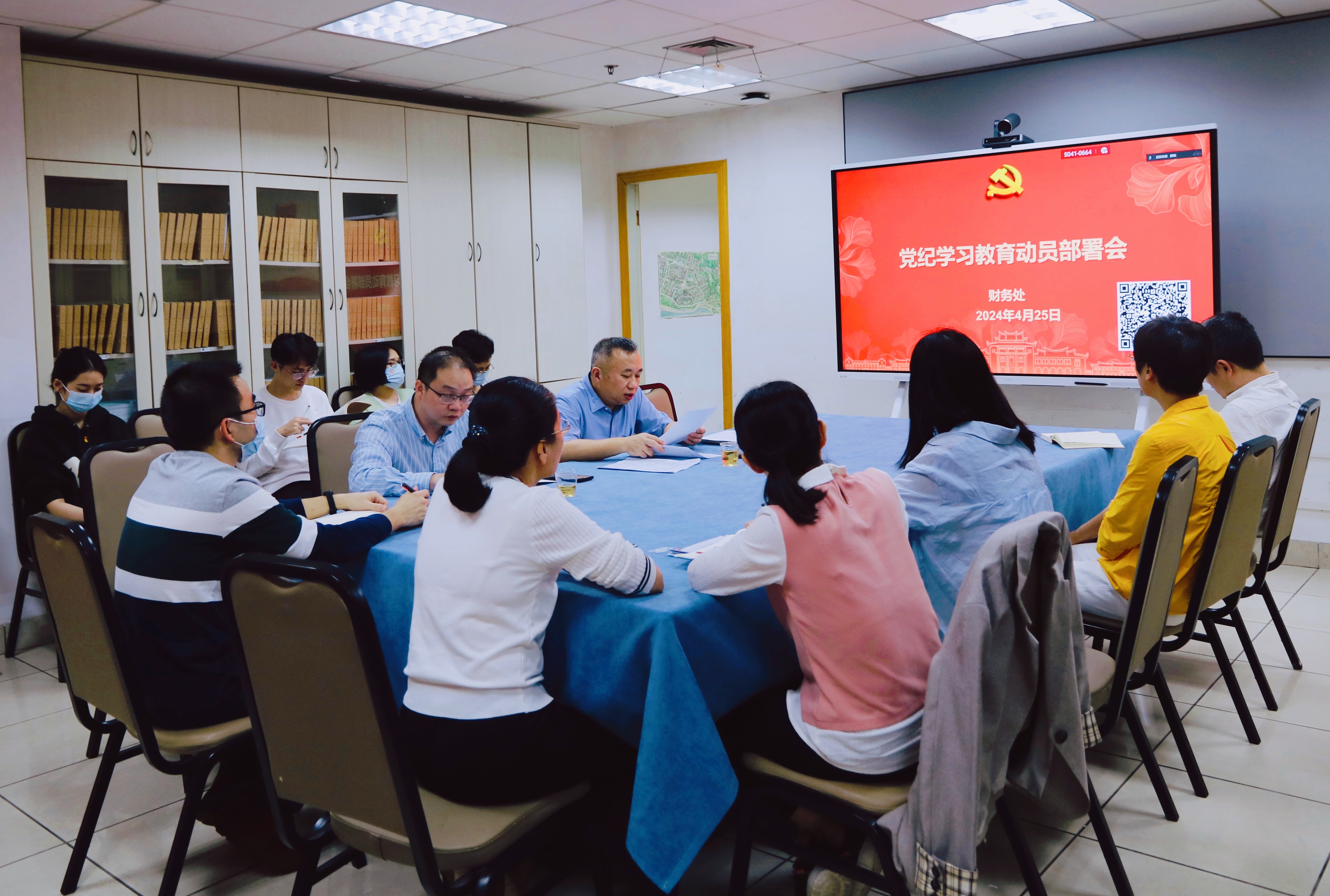 为深入贯彻落实习近平总书记关于党纪学习教育的重要讲话精神,2024年4月25日下午,在颂恩楼414会议室,财务处召开党纪学习教育动员部署会暨第一次集中学习,全体党员参加会议。
