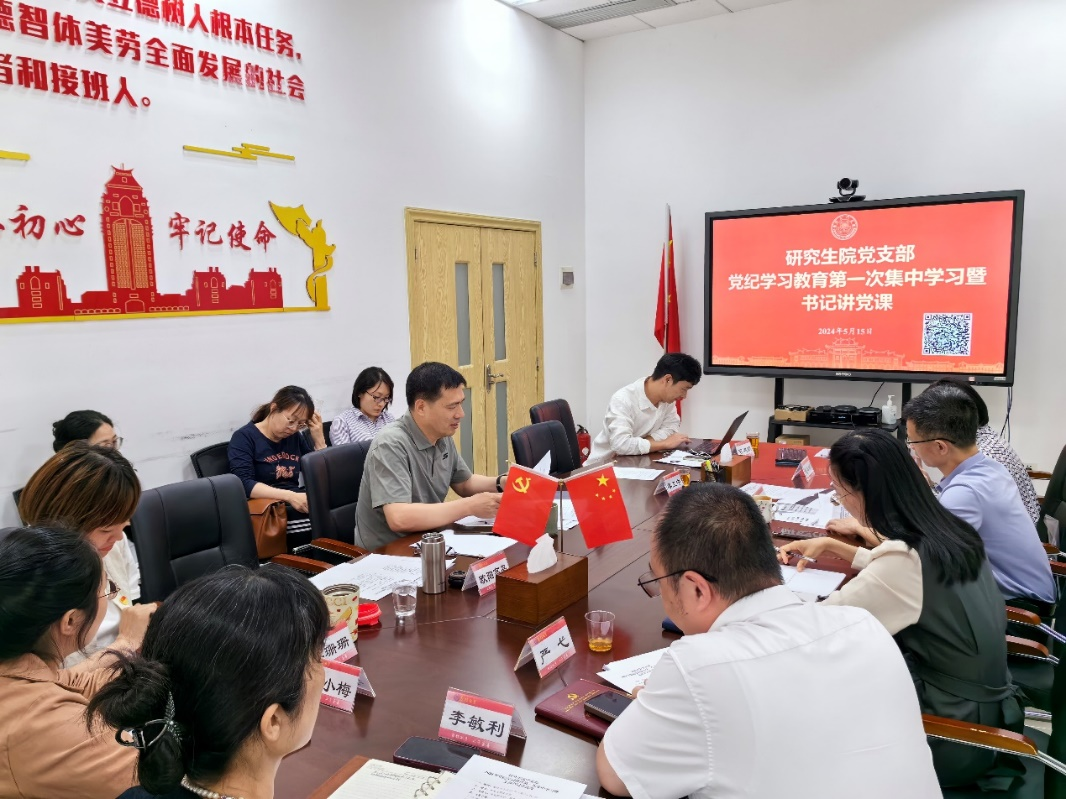 为深入贯彻落实习近平总书记关于党纪学习教育的重要讲话精神,深入学习贯彻修订后的《中国共产党纪律处分条例》,5月15日,研究生院党支部在研究生院会议室开展第一次党纪集中学习交流会。会议由研究生院党支部书记、常务副院长谢兆雄主持。
