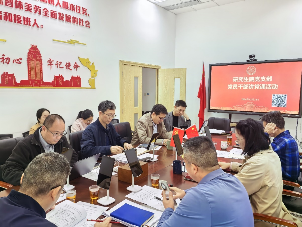 12月24日上午,研究生院党支部举行学习贯彻全国教育大会精神的专题理论学习暨党员干部讲党课活动,活动由党支部书记、研究生院常务副院长谢兆雄同志主持,研究生院全体党员干部参加此次学习活动。