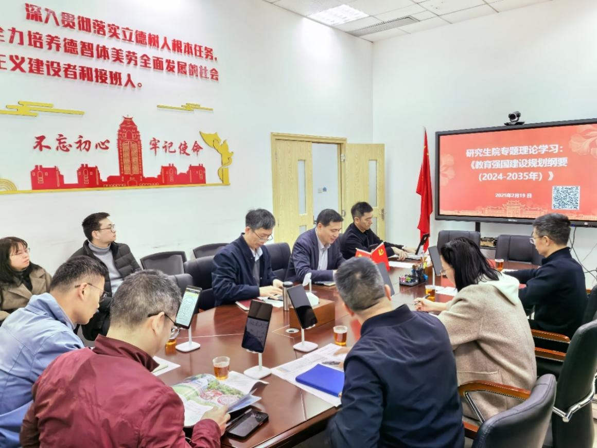 为深入贯彻落实党中央关于教育强国建设的战略部署,推动部门精准把握政策内涵,2月19日上午,研究生院党支部召开主题党日活动,集中学习研讨《教育强国建设规划纲要(2024—2035年)》(以下简称《纲要》)。党支部书记、研究生院常务副院长谢兆雄同志主持会议,全体党员干部和工作人员参加。