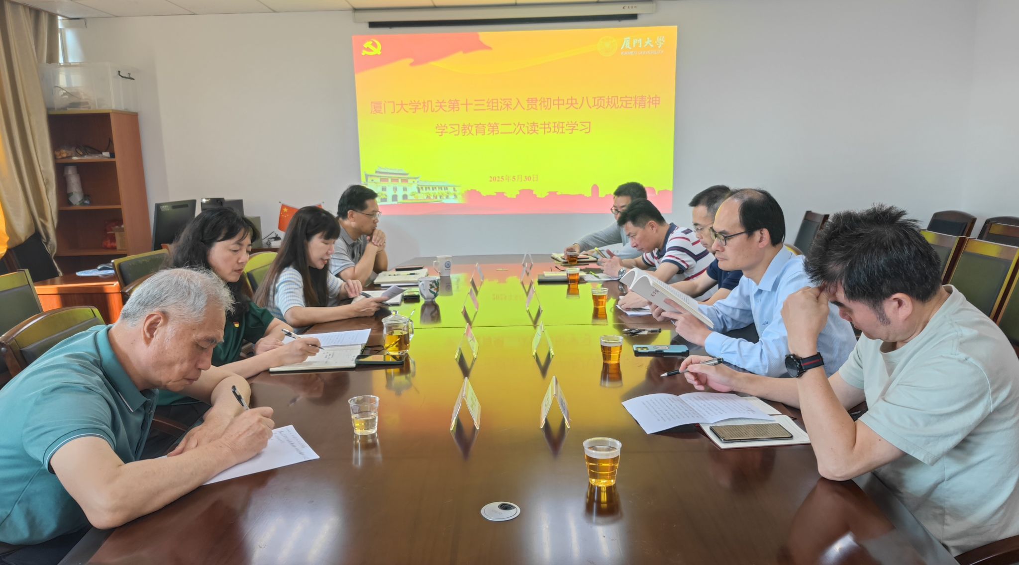 5月30日下午,厦门大学机关第十三组深入贯彻中央八项规定精神学习教育第二次读书班学习会在颂恩楼615会议室举行。机关党委委员、校工会常务副主席洪秋霞主持会议。继续教育管理处处长孙梓光,学报(自然版)编辑部主任张剑文,学报(哲社版)编辑部主任黄寿峰,继续教育管理处副处长范光胜,学报(哲社版)编辑部副主任陈双燕,校工会副主席余炳建、茹晓燕等同志参加学习。