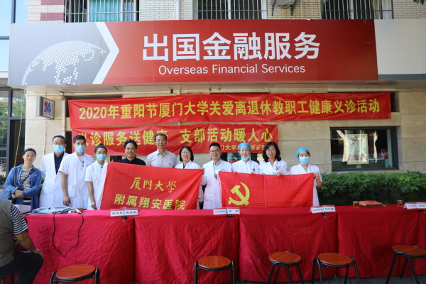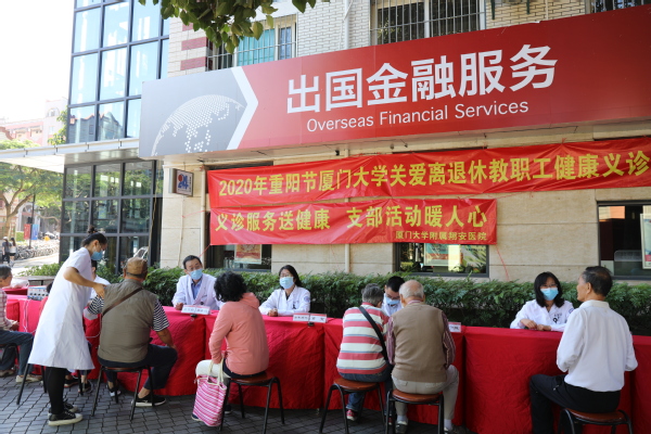 10月25日,离退休工作部党支部与厦门大学附属翔安医院在三家村学生活动广场共同举办“2020年重阳节厦门大学关爱离退休教职工健康义诊活动”。来自附属翔安医院老年病科、康复医学科、泌尿外科、内分泌科和心内科的多位专家和医护人员为我校离退休教职工提供健康义诊服务。校党委副书记赖虹凯来到现场看望慰问老同志。