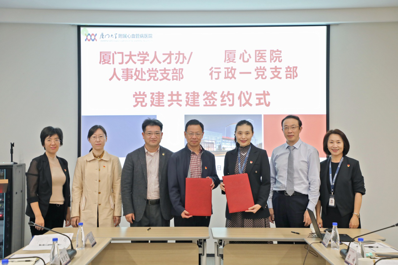 在座谈交流中,厦门大学人才办/人事处党支部李军书记、厦门大学附属心血管病医院行政一支部陈媛书记分别介绍了两单位的党建情况,并在江云宝副校长的见证下,举行了支部党建共建签约仪式。