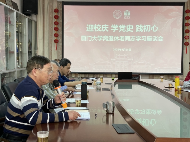 最后,老党员们结合自身经历,畅谈感想体会。大家认为,通过两场报告,对百年校庆筹备工作有了更为全面深入的了解,为厦门大学拥有的百年辉煌历史和取得的成绩倍感骄傲自豪,同时在学习厦门大学校史、革命史的过程中也加深了对中国共产党百年历程的了解。外文学院退休教工支部书记张礼龙表示,看到学校百年校庆各项活动安排周到、设计人性化感到十分欣慰,同时校友们慷慨捐助学校建设也令人非常感动。老教授协会党员代表周妙群说到,作为一个66年党龄的老党员,我看到我们党虽然在发展中历经曲折,但我们要从大局看、向前看,总结成功经验和错误教训,在党史学习教育中跟着党走向更加美好的未来。老教授协会党员代表杨聪凤谈到,听了黄福才教授对厦大早期革命史的讲述,作为厦大人感到十分光荣,同时也感受到历史赋予的重要使命,作为老党员要尽我们的能力,传承革命精神,为实现中华民族伟大复兴继续做贡献。