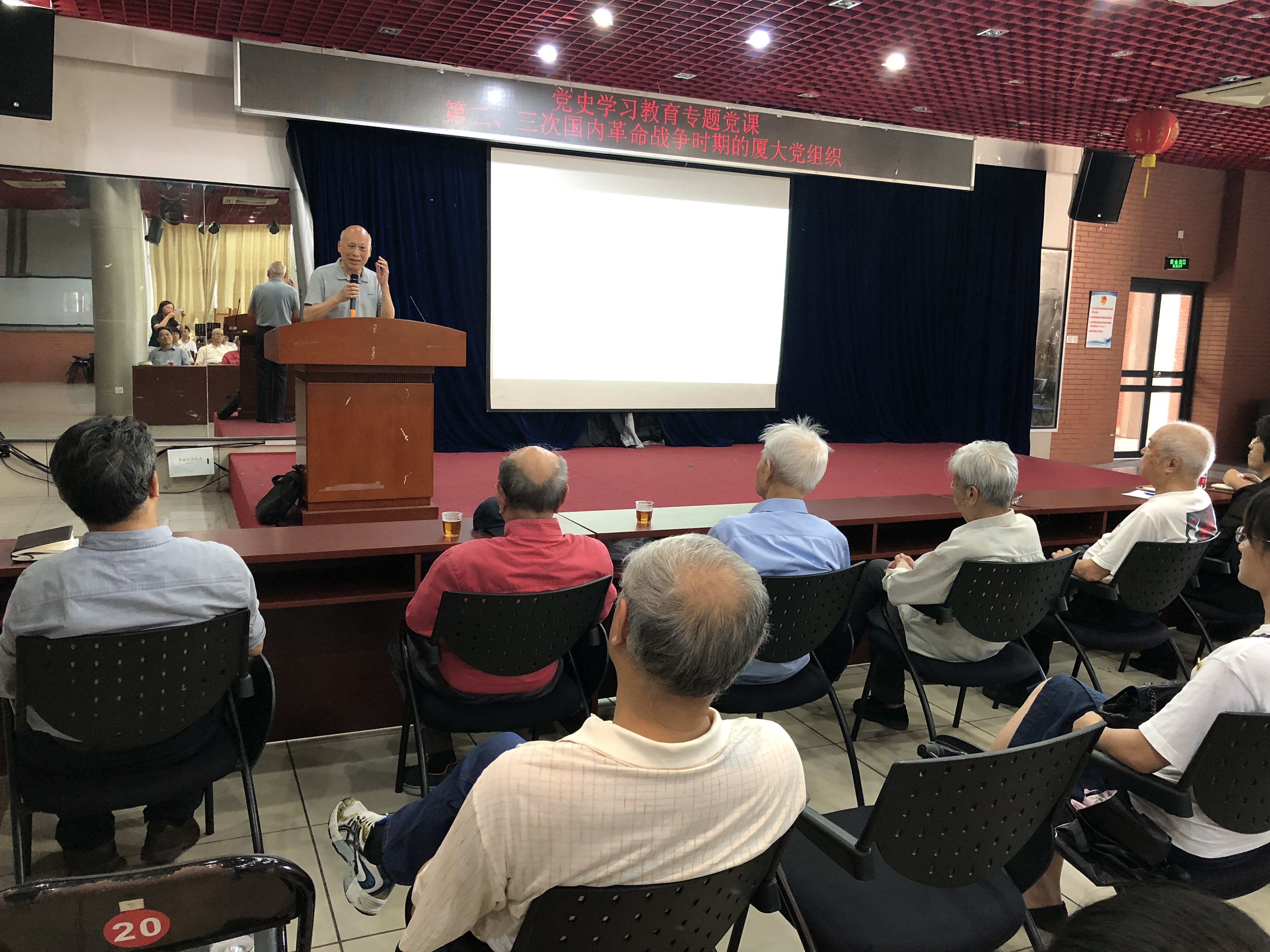5月10日下午,离退休工作部党支部和人才办/人事处党支部在自钦楼二楼报告厅联合举办党史学习教育专题党课,邀请了人文学院历史系教授、校关工委副主任、原党委宣传部、组织部部长颜章炮为大家讲授题为《第二、三次国内战争时期的厦大党组织》的报告,两个支部全体党员和离休干部党总支,共建单位滨海街道白城、演武社区党支部党员参加。党课由离退休处副处长周一钦主持。