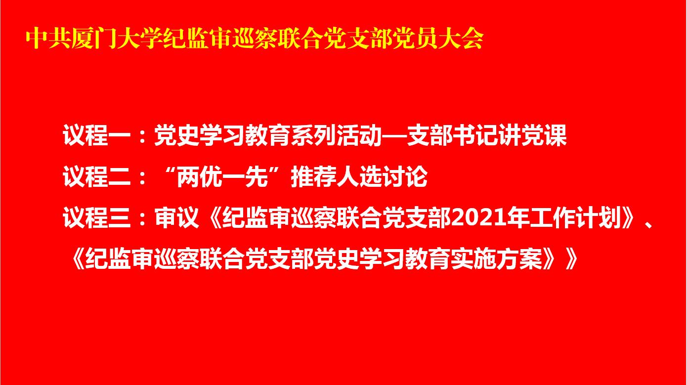 支部大会还审议通过了《纪监审巡察联合党支部2021年工作计划》和《纪监审巡察联合党支部党史学习教育实施方案》,讨论确定了“两优一先”推荐人选。