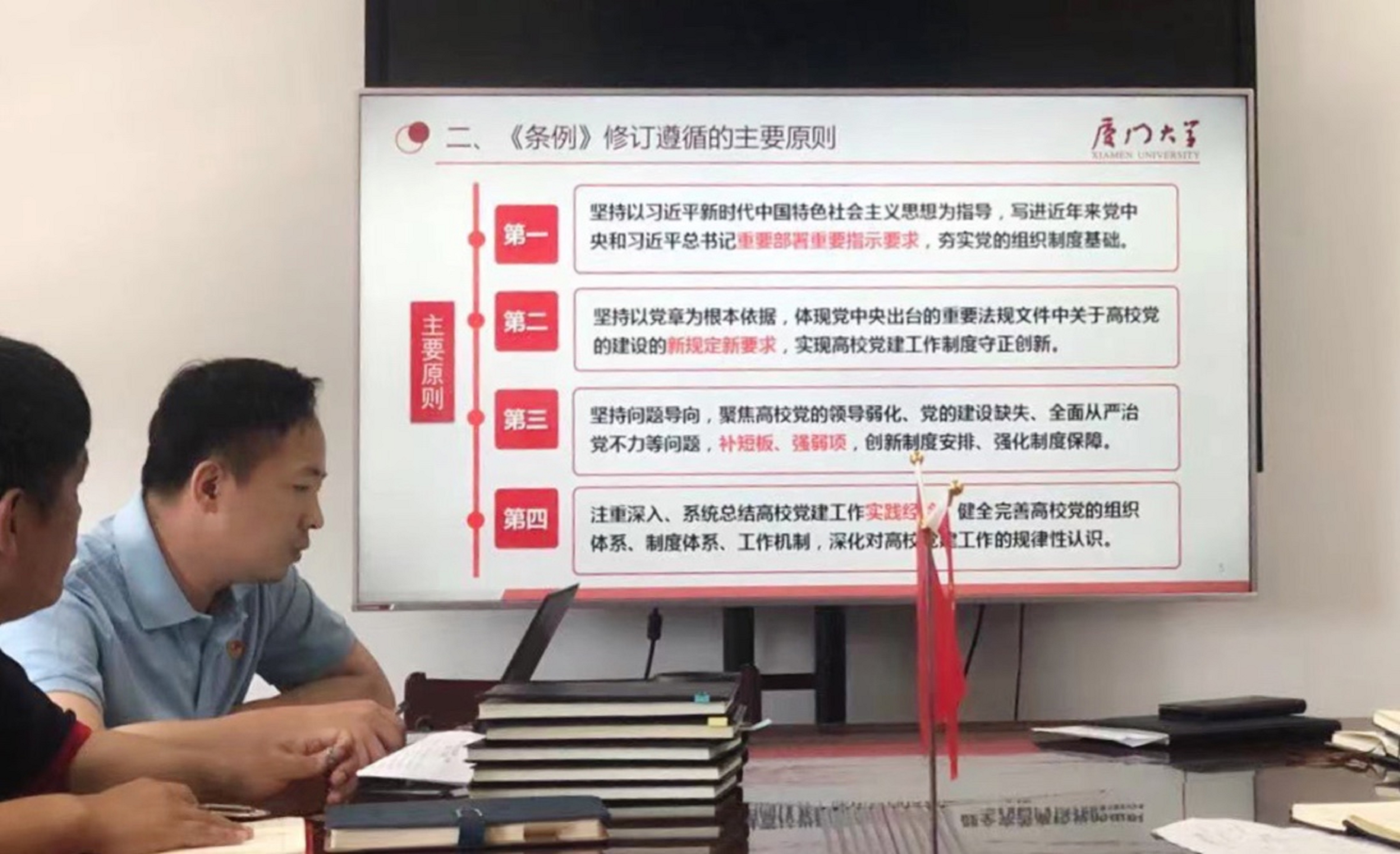 支部组织委员詹伟峰对新修订的《条例》作专题报告,介绍《条例》修订的背景、过程和意义,并带领全体党员重点学习了《条例》的修订内容。新修订的《条例》以习近平新时代中国特色社会主义思想为指导,以党章为根本依据,对高校基层组织工作作出全面规范,为深入贯彻落实新时代党的建设总要求和新时代党的组织路线,全面加强新时代高校党的建设提供了基本遵循和制度保障,体现党中央出台的重要法规文件中关于高校党的建设的新规定新要求,实现高校党建工作制度守正创新。