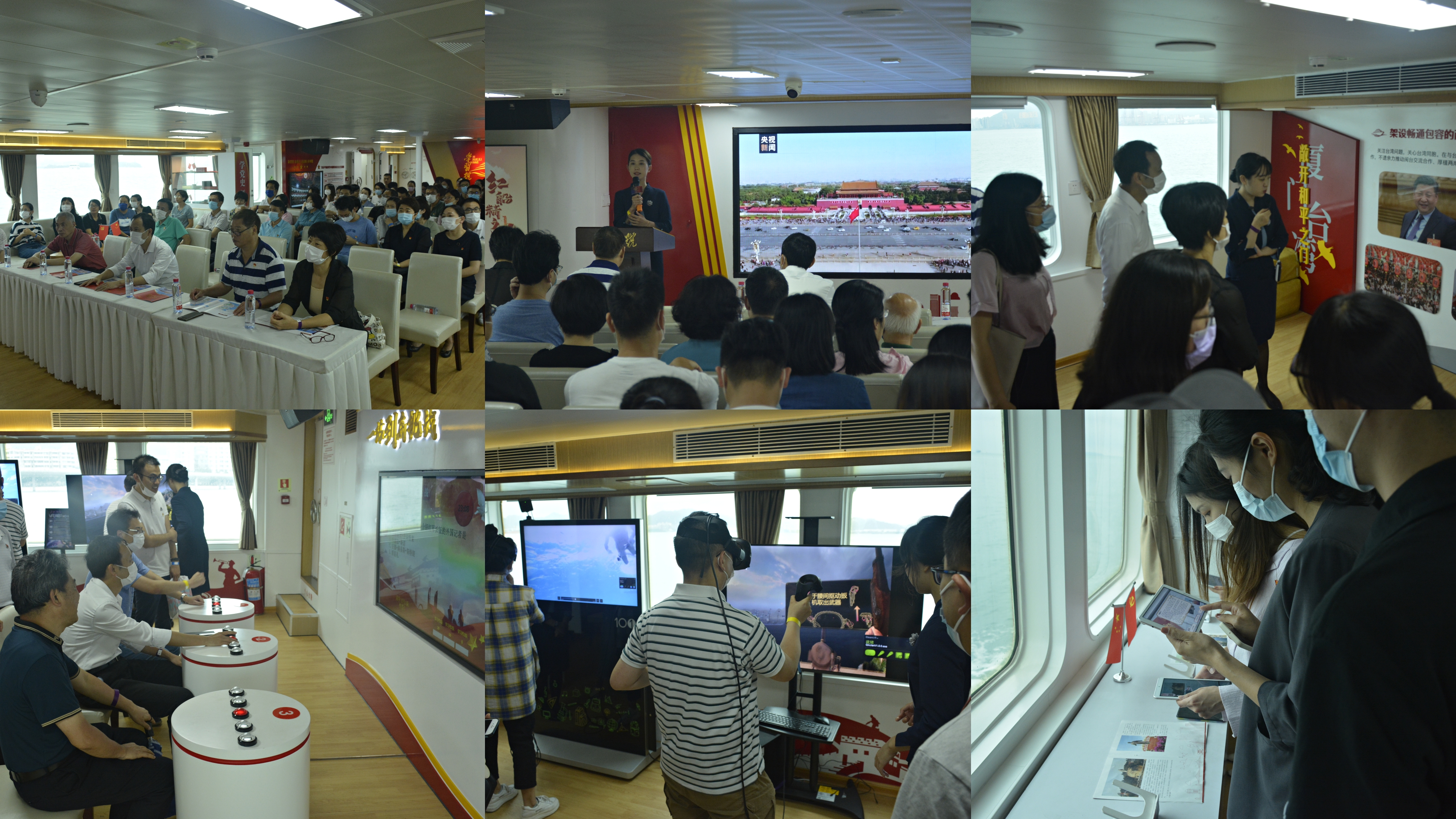 海上学史之旅在一声汽笛响后正式起航。在讲解员的带领下,党员们一起穿越革命之门、扣响大厦之门、开启风尚之门、敞开和平之门,共同学习习近平新时代中国特色社会主义思想在福建时期的萌芽、孕育与实践,感受厦门经济特区、海峡两岸的发展变化历程,了解厦门红色革命历史资源。在多功能互动区,支部党员借助虚拟现实、增强现实等多项前沿展示与互动技术进行沉浸式党史学习教育,踊跃参加“一站到底”党史知识竞赛和革命歌曲竞猜小游戏等。