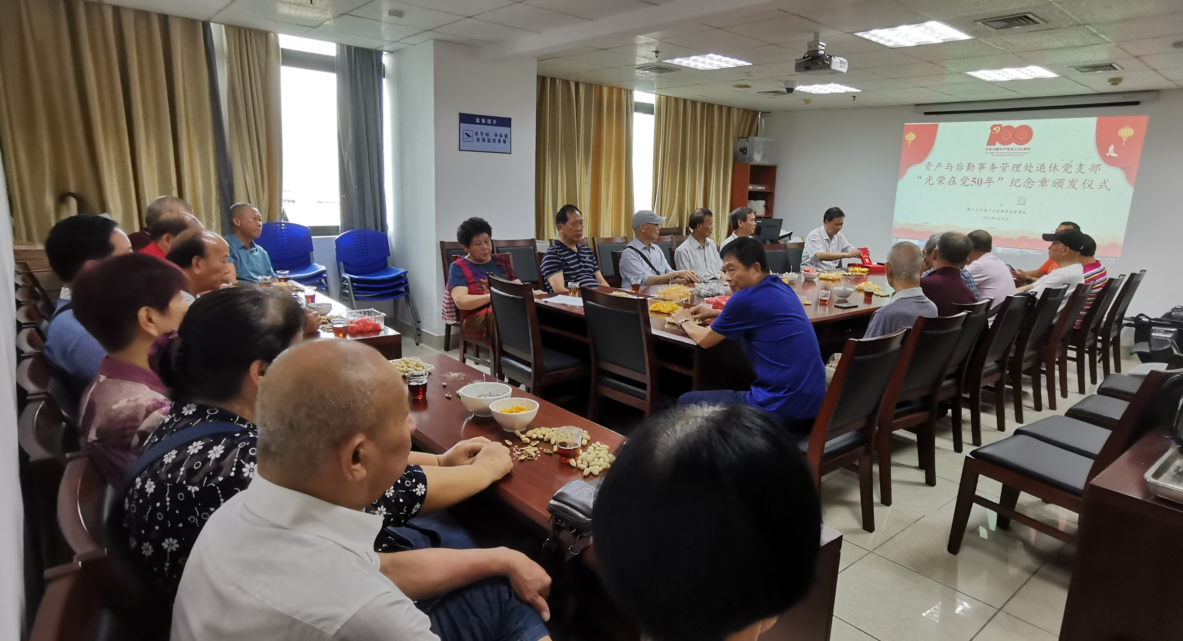 50年党龄,50载光荣。6月24日上午,资产与后勤事务管理处退休第一、第二党支部在颂恩楼615室举行“光荣在党50年”纪念章颁发仪式,共有13名老党员获此殊荣。