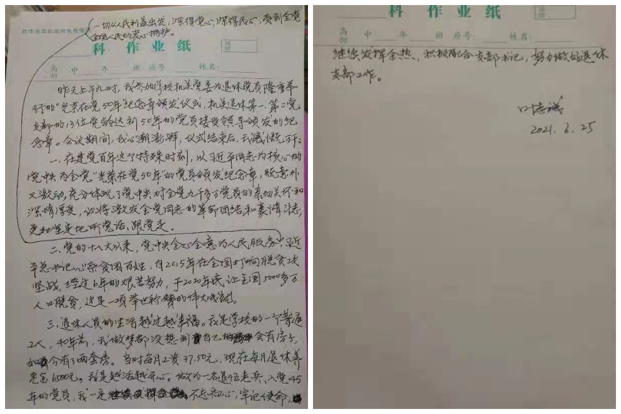 老党员叶志诚党龄已有45年,在看到老伙伴们受颁纪念章后,他心潮澎湃,亲笔抒写体验与感受,表达了对党的深情和退休不褪色、为党的事业发挥余热的拳拳之心。