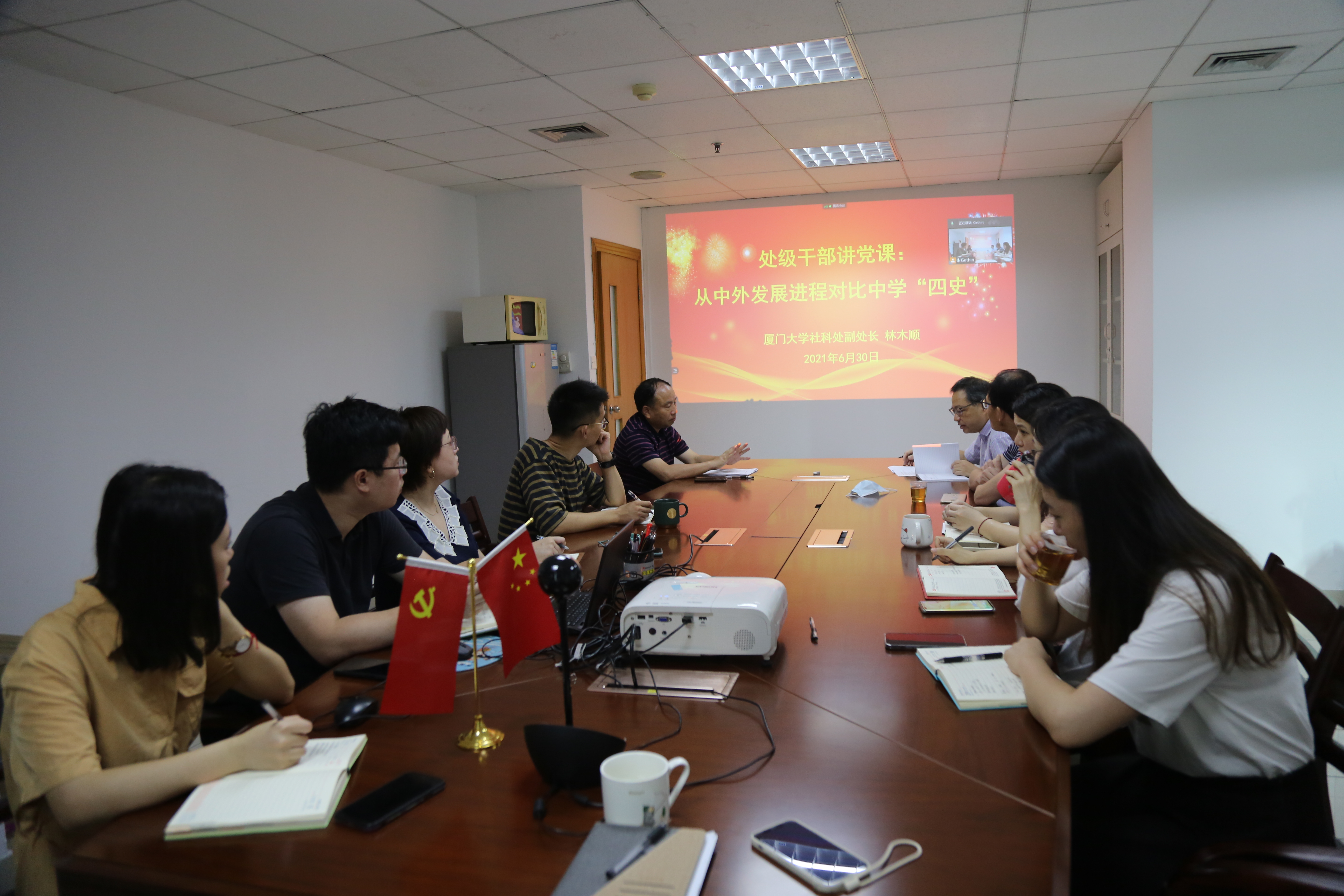 6月30日上午,在中国共产党百岁华诞到来之际,社科处党支部开展“四史”学习教育专题党课活动。社科处副处长林木顺作《从中外发展进程对比中学“四史“》的主题报告,社科处全体成员参会,本次会议由社科处党支部书记、处长高和荣主持。