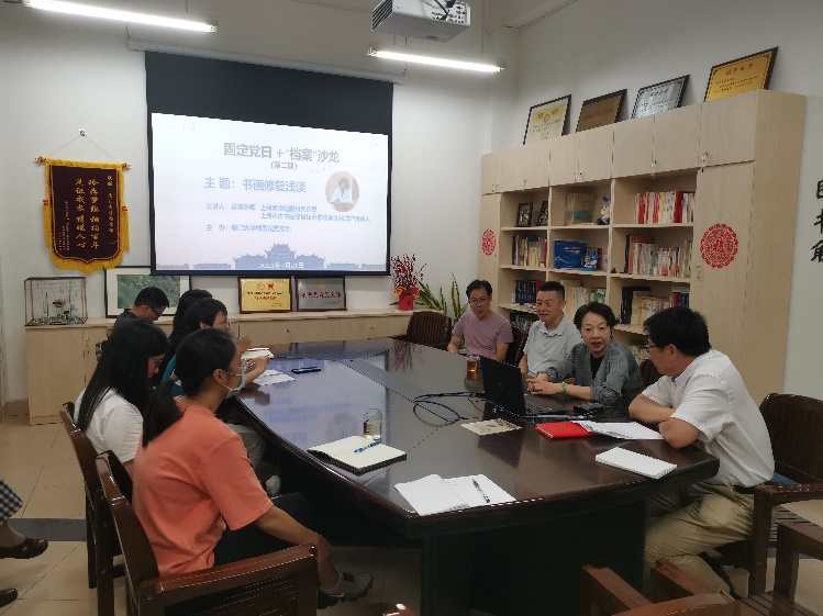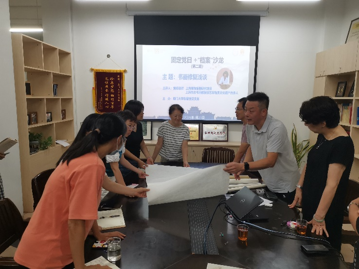 为推进党建工作与业务工作深度融合,档案馆党支部精心筹划,于7月21日组织开展第二期固定党日+“档案”沙龙活动。本次沙龙邀请了上海博物馆副研究馆员、上海市古书画修复技艺非物质文化遗产传承人黄瑛作《书画修复浅谈》的专题讲座,还邀请了造纸专家谢巍巍对书画用纸进行介绍。