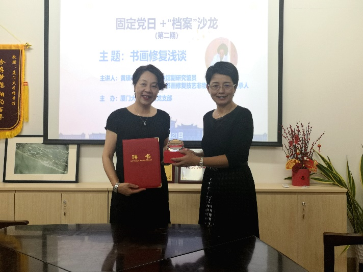 沙龙结束后,档案馆党支部书记石慧霞为黄瑛老师颁发了厦门大学档案馆书画修复工作指导专家敦聘证书和沙龙讲座纪念牌。