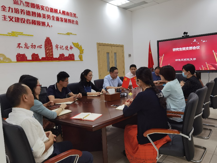 杨柳同志以《回看来时路 砥砺新征程》为主题,从开天辟地、改天换地、翻天覆地、惊天动地等4个章节,带领全体党员回顾了中国共产党从播下革命火种的小小红船到领航复兴伟业的巍巍巨轮走过的光辉历程,并对应每个历史时期,学习交流了中国共产党人精神谱系以及个人心得体会。她指出,习近平新时代中国特色社会主义思想是指引我们进行伟大斗争、建设伟大工程、推进伟大事业、实现伟大梦想的行动指南,必将引领全体中华儿女在中华民族伟大复兴的道路上不断书写波澜壮阔的时代答卷。我们生逢盛世,有幸参与新的时代精神的塑造过程,要始终不忘初心、牢记使命,立足本职岗位,以新的担当作为,做好研究生教育战线上的“螺丝钉”。
