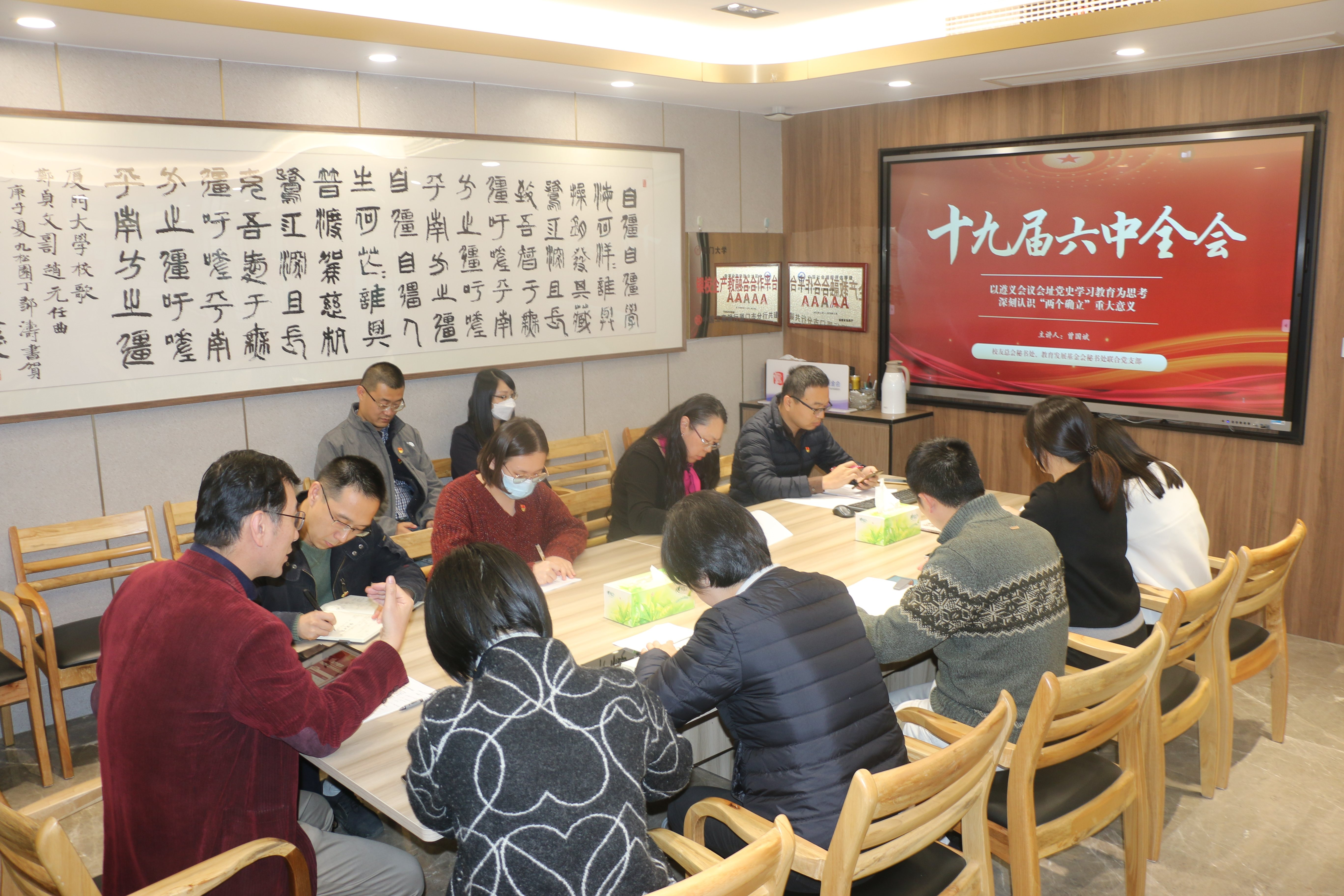 党支部书记、教育发展基金会秘书长曾国斌结合自身赴遵义会议旧址参观学习的心得体会,带领大家集体学习了党的十九届六中全会有关决议,全面深刻地解读了全会精神。他指出,学史明理、学史力行,重温遵义会议会址,深化党史学习教育,让我们深刻意识到,树立明确而坚强的领导核心,永远是关乎党和国家前途命运、党和人民事业成败的根本性问题,只有当全党有了集中统一的核心,党中央才有权威、党才有力量。党的十九届六中全会明确指出,党确立习近平同志党中央的核心、全党的核心地位,确立习近平新时代中国特色社会主义思想的指导地位,既是时代发展的必然选择和人民群众的众望所归,也是实现国家第二个百年奋斗目标和中华民族伟大复兴的根本遵循和科学指南。全体党员同志要在日常工作中积极担当、主动作为,把“学、思、用”贯通起来,增强“四个意识”、坚定“四个自信”,以实际行动做“两个确立”忠诚拥护者、“两个维护”示范引领者,以一流的工作业绩助力学校新百年争创世界一流。