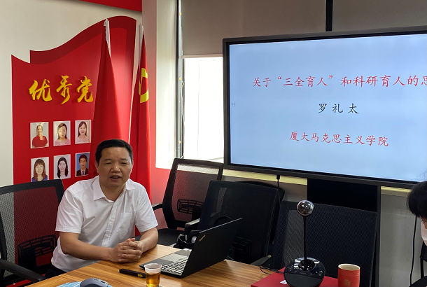 罗礼太从习近平总书记系列重要讲话及总书记致厦门大学建校100周年的贺信展开,强调高校为党育人、为国育才,办好中国特色社会主义教育的责任与担当,并结合自身经验,提出高校教师要有良好的素养和广阔的视野,铸魂育人、立德树人,既做“四有好老师”又合“六要”新要求,为学生树立正确的榜样。随后,他为大家解析了新时代高校“三全育人”的内涵及科研育人的目标、思路和举措。他指出“三全育人”核心是“人”,关键是“全”,基础是“合”,要深入推进“三全育人”综合改革,做到“时时育人、处处育人、人人育人、事事育人、分分育人”。科研育人作为“三全育人”的重要一环,要建立教研一体、学研相济的科教协同育人机制,打造高水平科研育人队伍,实现科研队伍、成果、精神、实践等协同育人。最后,他通过多个科研育人实际案例为大家提供科研育人工作思路,鼓励科技处同志努力交出新时代厦大为党育人、为国育才的优秀答卷。