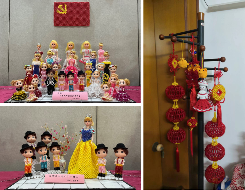 为庆祝中国共产党成立101周年,喜迎党的二十大胜利召开,人才办/人事处党支部的退休党员同志康水秀夜以继日精心创作,用七彩珠子穿串出《中国红:喜迎二十大》、《合唱团:没有共产党就没有新中国》等丰富多彩的手工作品,用实际行动向党的二十大献礼。