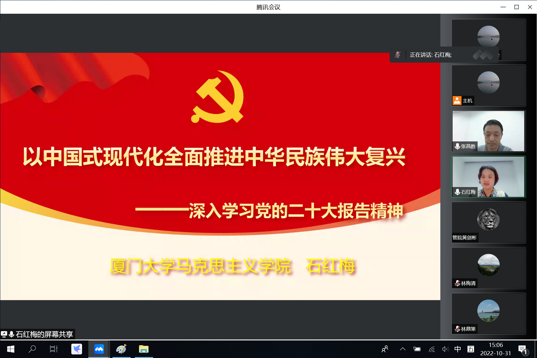 为掀起学习宣传贯彻热潮,推动党的二十大精神在学校实验室管理教工的心中落地生根,10月31日,实验室与设备管理处举办“厦门大学实验室管理人员业务能力提升系列讲座”,邀请马克思主义学院党委书记石红梅教授为学校实验室管理教工解读党的二十大精神。根据学校疫情防控要求,培训讲座采取线上视频会议的方式,实验室与设备管理处副处长张昌胜主持培训讲座。