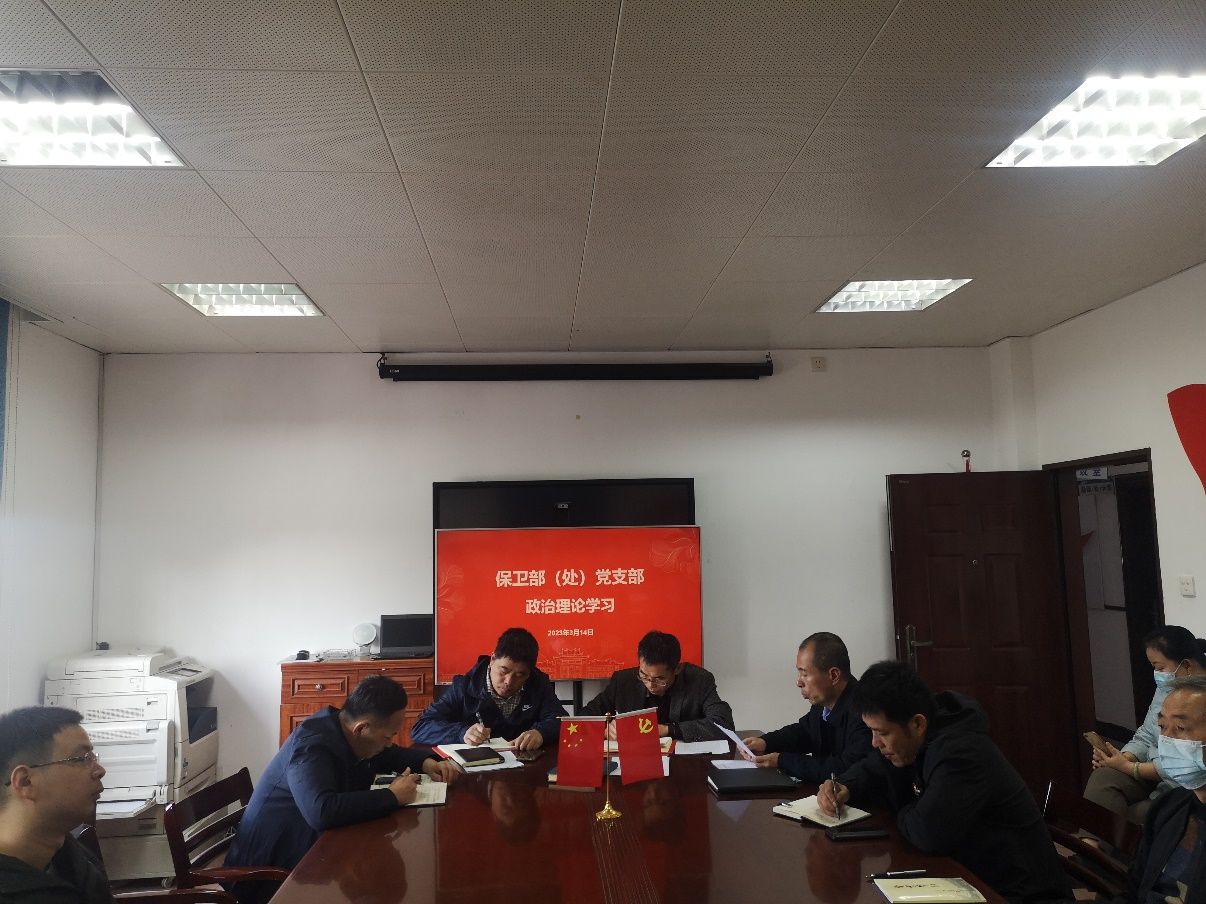 2023年3月14日上午,保卫部(处)党支部组织学习习近平总书记在中共中央政治局第三次集体学习时的重要讲话精神以及中国共产党第二十届中央委员会第二次全体会议公报。会上,党支部纪检委员林庆斌带领全体干部认真学习了习近平总书记的重要讲话精神。