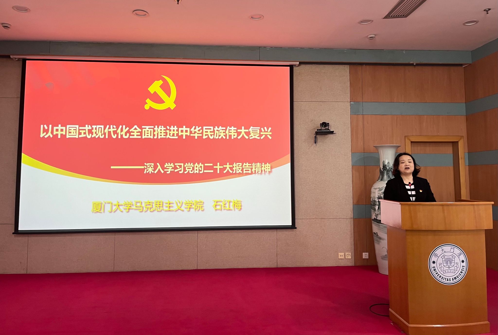 党的二十大鲜明提出新时代新征程党的使命任务,擘画了中国式现代化宏伟蓝图。为进一步深入学习宣传贯彻党的二十大精神,把党员同志的思想和行动统一到党的二十大精神上来。3月14日下午,财务处党支部联合审计处党支部、科技处党支部、社科处党支部、基建处党支部、中医系教工党支部、建筑与土木工程学院党政后勤教工党支部、管理学院2021级审计专硕支部等7个党支部开展共建联学主题党日活动,邀请厦门大学马克思主义学院党委书记石红梅教授作《以中国式现代化全面推进中华民族伟大复兴——深入学习党的二十大精神》的专题辅导报告。