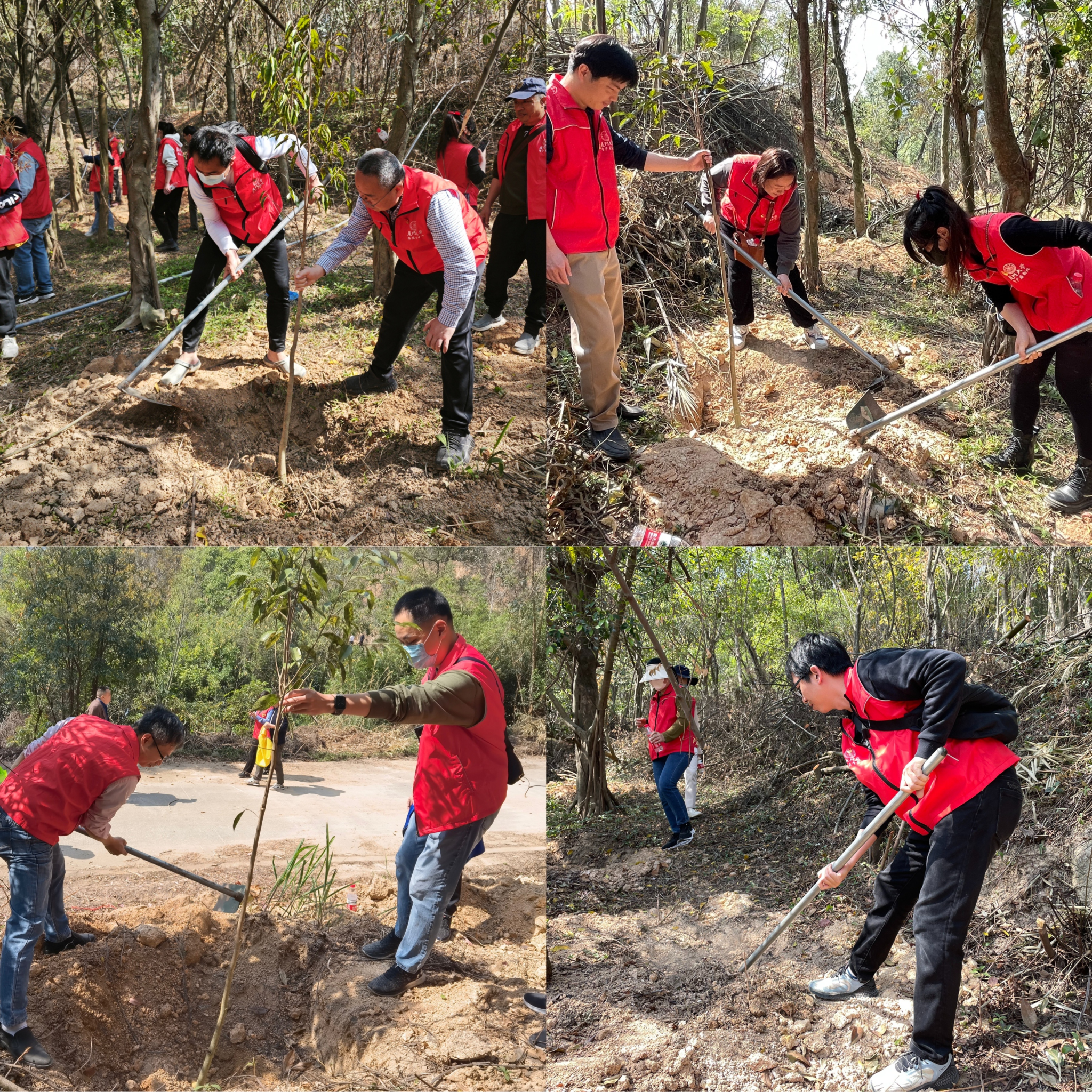 莺飞草长春风吹,植树添绿正当时。植树现场党旗飘扬,大家三五成组,挥锄刨土、扶苗围堰、夯实泥土,干劲十足,齐心协力将一株株沉香树苗认真细心地栽植在规划植树点上。