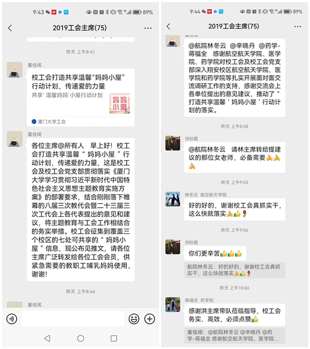 校工会根据调研会上哺乳妈妈反映的跨校区使用哺乳室的需求,支部弘扬“真抓实干、马上就办”的精神,从关心关爱孕期和哺乳期女教职工群体出发,5月23日上午校工会沟通联系已建成“妈妈小屋”的基层部门工会,在各部门工会的大力支持下,共征集到覆盖3个校区的7处可共享的“妈妈小屋”信息,供可能紧急需要的教职工哺乳妈妈使用。凸显具有人文关怀的学校文化,制定的传递爱的力量的关爱计划。